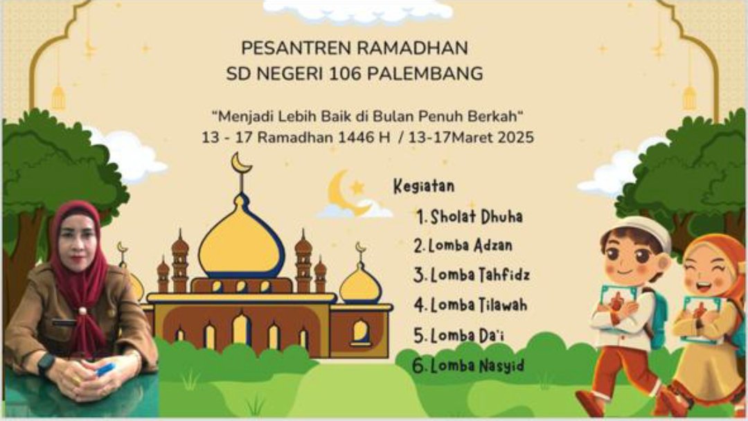 Kegiatan Pesantren Ramadhan yang dilaksanakan di Gedung SDN 106 Palembang, berlangsung dari tanggal 13 s/d 17 Maret 2025 ini di buka langsung oleh Kepala SDN 106 Palembang, Yanita Aquarena SE.,M.Si