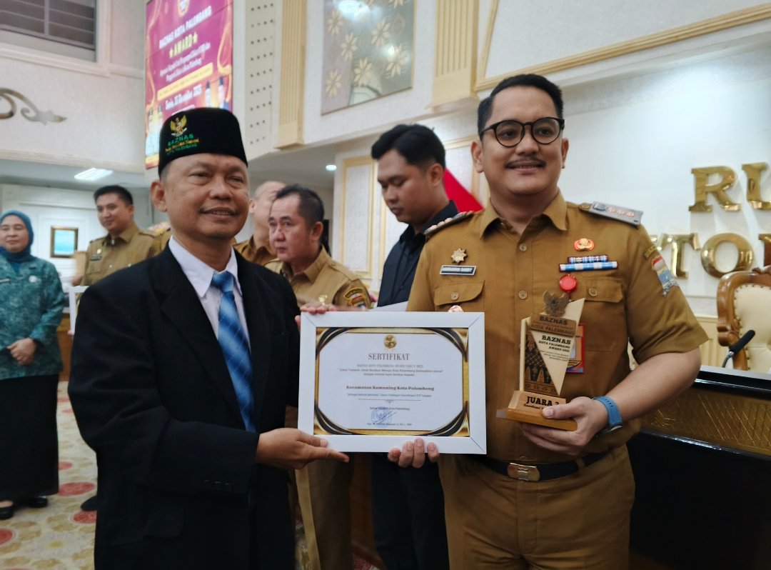 Sumsel.Radarinformasinews.com, Palembang – Camat Kemuning Dr. Amiruddin Sandy, S.STP., M.Si menerima penghargaan Juara III Kategori Unit Pengumpul Zakat (UPZ) Teladan Tingkat Kota Palembang Tahun 2025 dari Badan Amil Zakat Nasional (Baznas) Kota Palembang, pada Senin (15/12/2025).