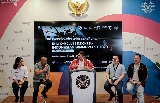 Menparekraf Sandiaga Uno (tengah) mendukung pelaksanaan Indonesia Bimmerfest 2023 yang akan berlangsung di Sirkuit Internasional Mandalika dalam “The Weekly Brief with Sandi Uno” di Gedung Sapta Pesona, Jakarta, Senin (30/10/2023).