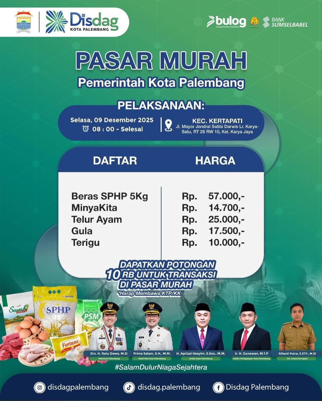 RadarInformasinews.com. Palembang – Masyarakat Kecamatan Kertapati menyambut antusias pelaksanaan Pasar Murah yang digelar Pemerintah Kota Palembang pada Selasa, 09 Desember 2025, mulai pukul 08.00 WIB hingga selesai. Kegiatan ini berlokasi di Jl. Mayor Jendral Satibi Darwis, Lorong Karya-Satu RT 28 RW 10, Kelurahan Karya Jaya.