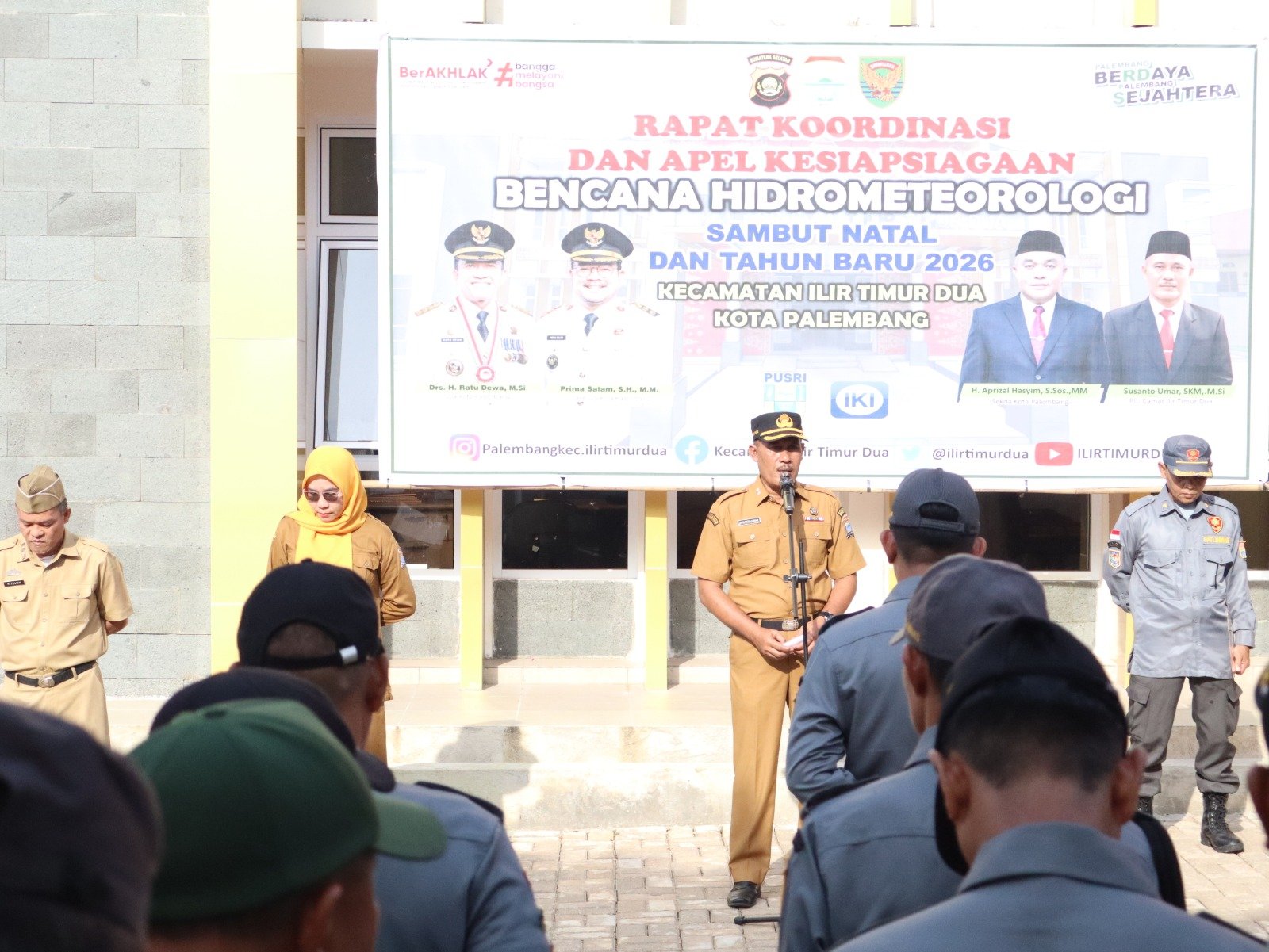 Radarinformasi.com. Palembang – Plt. Camat Ilir Timur Dua, Susanto Umar, S.KM., M.Si, memimpin langsung kegiatan Apel Kesiapsiagaan Bencana Hidrometeorologi dalam rangka menyambut Natal dan Tahun Baru 2026, yang digelar di halaman Kantor Camat Ilir Timur Dua, Selasa (23/12/2025) pagi.