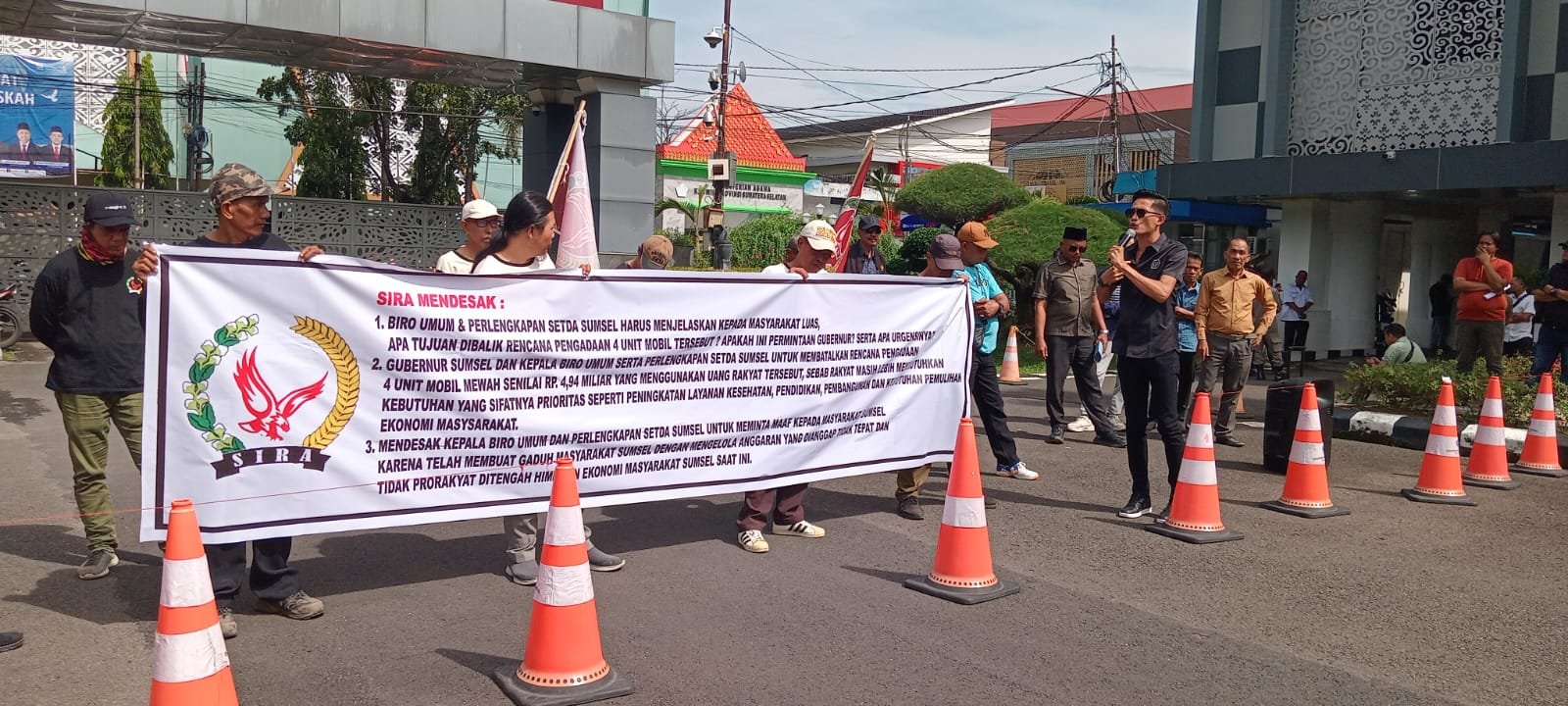 Aksi massa tersebut dipimpin langsung oleh Direktur SIRA, Rahmat Sandi Iqbal, SH, dan didampingi Rahmat Hidayat, SE Seketaris SIRA,”dalam orasinya, massa menyoroti rencana Pemerintah Provinsi Sumatera Selatan melalui Biro Umum dan Perlengkapan Setda Sumsel yang akan mengalokasikan anggaran untuk pengadaan empat unit mobil mewah senilai Rp4,94 miliar. Selain itu, juga terdapat rencana anggaran sebesar Rp3 miliar untuk pakaian dinas Gubernur dan Wakil Gubernur pada Tahun Anggaran 2026.