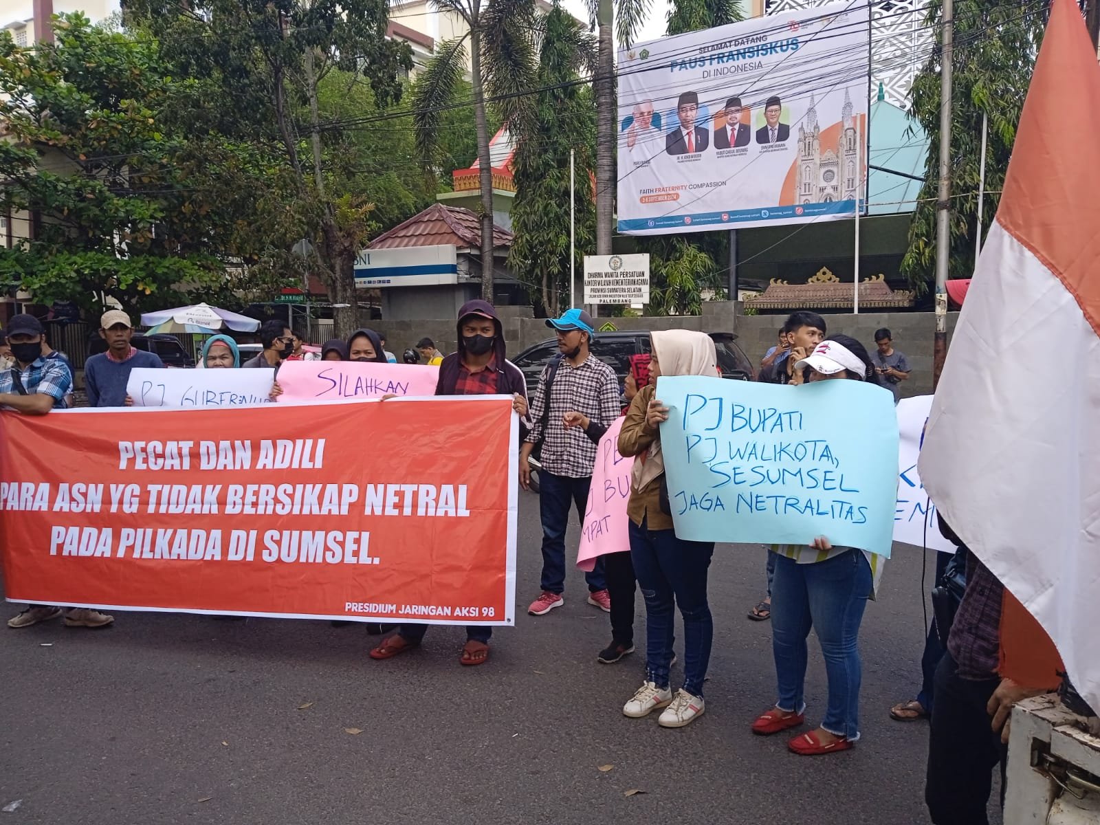 RadarInformasinews.com. Palembang,- Presidium Jaringan Aksi 98 menggelar aksi demo di Kantor Gubernur Sumsel, Jumat (6/9/2024). Massa aksi menuntut seluruh ASN, PJ Gubernur ,Bupati dan Walikota se Sumsel untuk menjaga netralitas dan kondusivitas sehingga Pilkada berjalan aman,tertib dan damai.